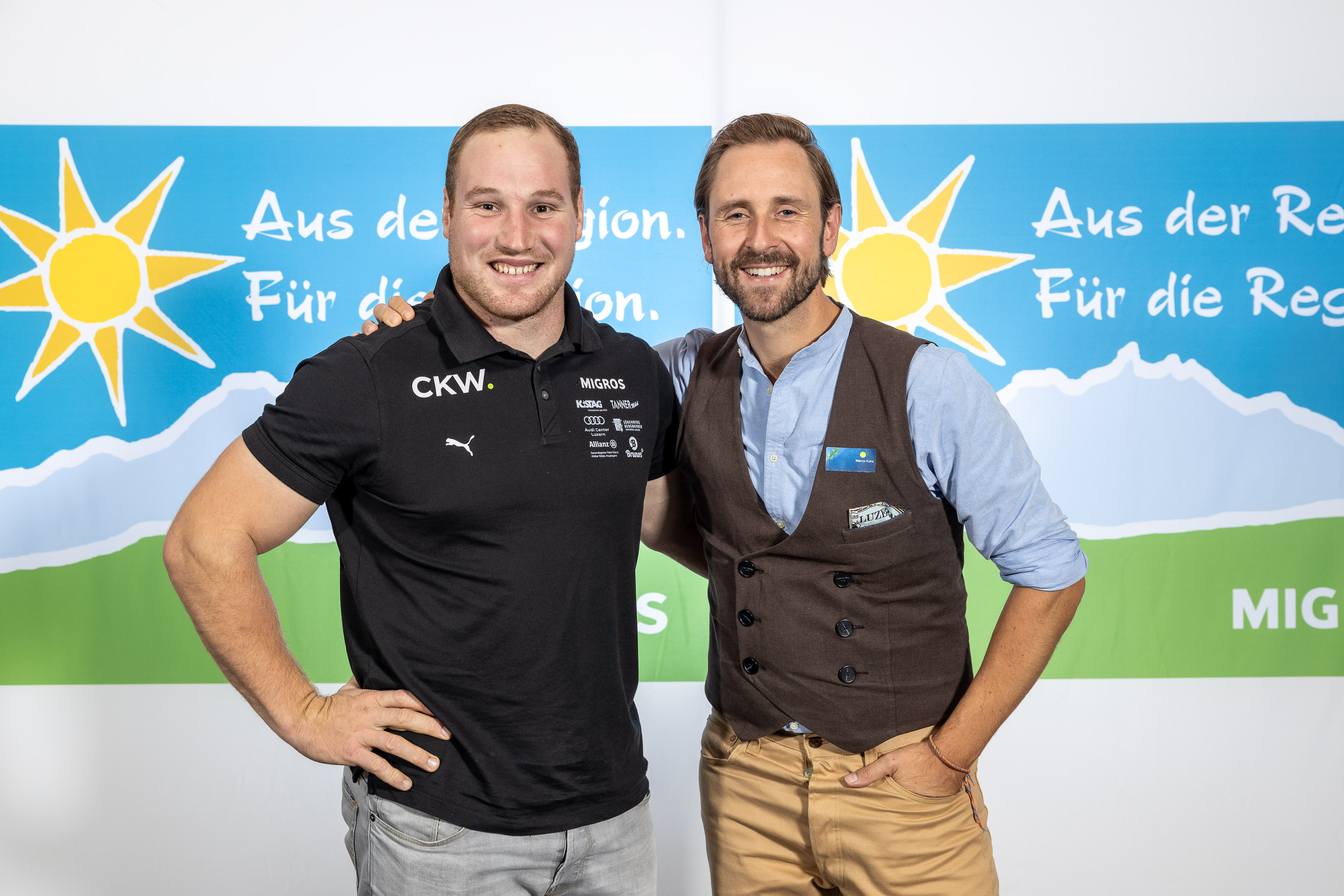 Bild 3: Ein Mann aus dem Sägemehl und einer mit Stimme: Schwingerkönig Joel Wicki (links) und Mundartsänger KUNZ (rechts) sind als AdR-Botschafter der Migros Luzern mit dabei.