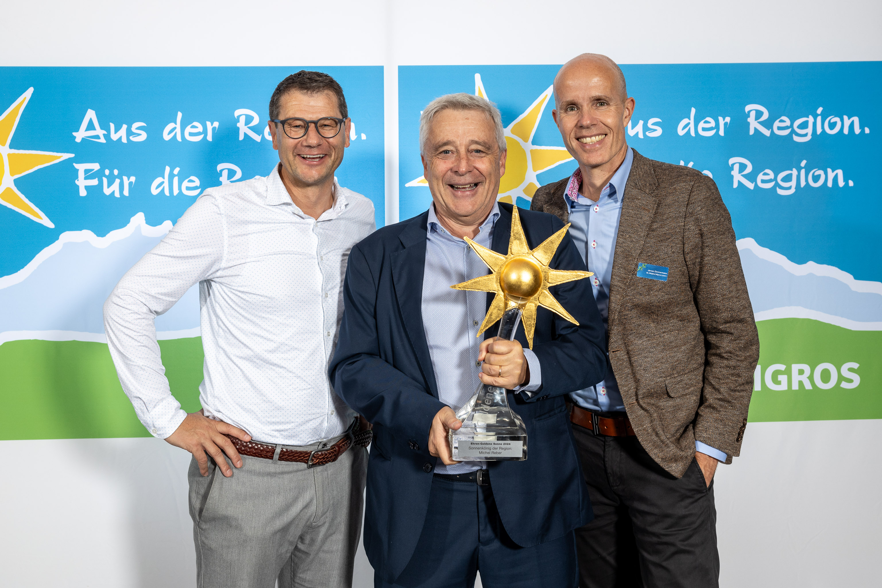Ein wichtiger AdR-Wegbegleiter, der das Label in den vergangenen 25 Jahren geprägt hat, ist Michel Reber. Der ehemalige Marketing-Kommunikationsleiter der Migros Luzern aus Buchrain hat sich in seiner Funktion für das Herkunftslabel engagiert – seit einem Jahr ist er nun im Ruhestand. "Michel Reber hat 'Aus der Region. Für die Region.' zusammen mit seinem Team massgeblich vorangetrieben. Dafür bedanken wir uns mit der 'Ehren-Goldenen-Sonne'", sagt Jeroen Zimmermann, Leiter Supermarkt der Migros Luzern.